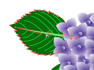 ダイレクト選択ツールであれば、クリックした単体のオブジェクトを選択することができるので、Shiftキーを押しながら、葉っぱを構成しているパーツをひとつひとつ追加選択できますが、花に隠れてしまっている葉脈を選択するのが困難です。