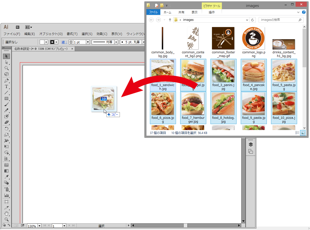 あ、ちなみにCS6以前の方でも複数配置が全くできないわけではなくて、荒業ですが、写真をフォルダ内で複数選択しておいてから、イラストレーターの画面内にドラッグ&ドロップで投げ込むことで配置が可能です。