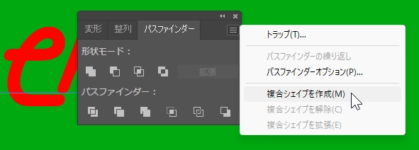文字が選択されている状態で、パネルメニュー→「複合シェイプを作成」を実行します。