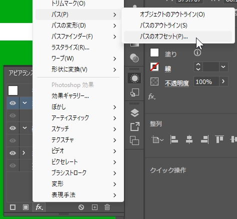 追加された「塗り」が選択されている状態で、「アピアランス」パネル下部の「fx」をクリックし、「パス」→「パスのオフセット」を実行します。
