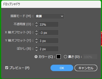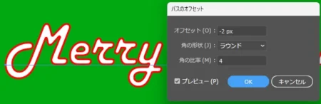 表示されたダイアログで「オフセット:-2」、「角の形状:ラウンド」、「角の比率:4」の指定をしてOKを実行します。(オフセットの数値は、文字の大きさで変えます)72ptだと-2くらいですが、32ptだと-1くらいに指定します。