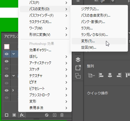 「アピアランス」パネル下部の「fx」をクリックし、「パスの変形」→「変形」を実行します。