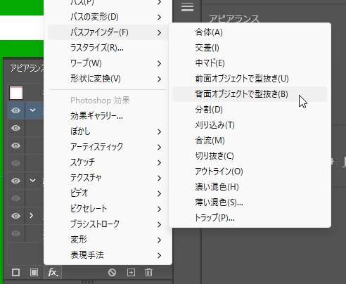 再び「塗り」を選択し、「アピアランス」パネル下部の「fx」をクリック→「パスファインダー」→「背面オブジェクトで型抜き」を実行します。