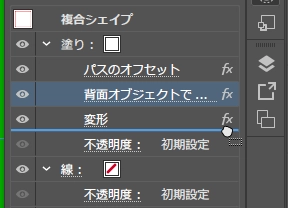 「アピアランス」パネル内、「背面オブジェクトで型抜き」をドラッグして「変形」の下に移動します。(項目の「fx」部分をドラッグすると動かしやすいです)