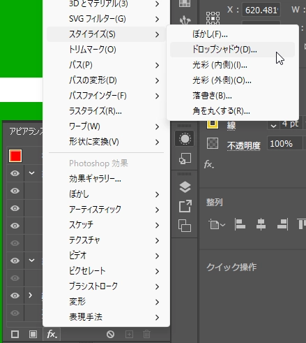 影を追加したい場合は、「アピアランス」パネル下部の「fx」をクリックし、「スタイライズ」→「ドロップシャドウ」を実行します。